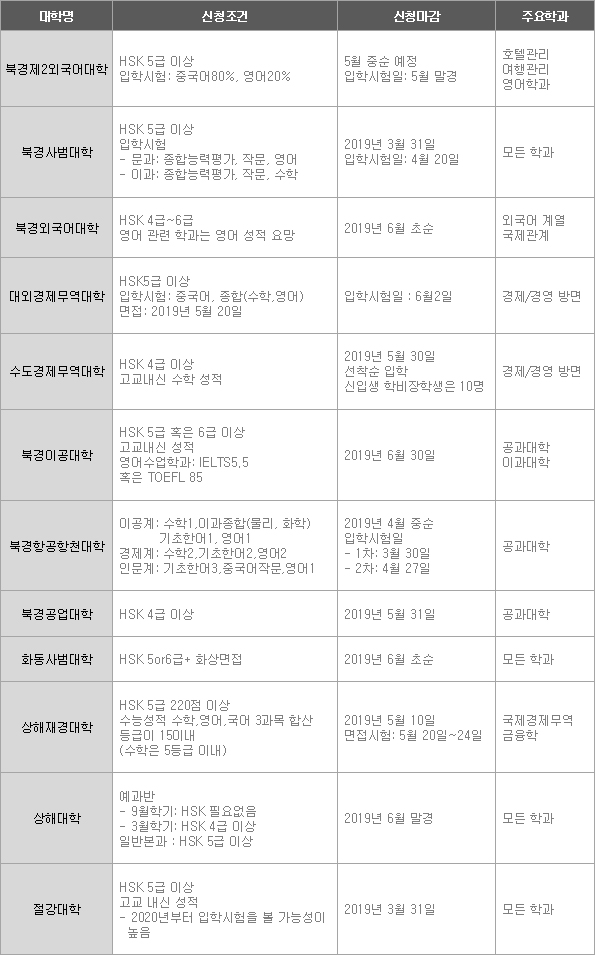 ºÏ°æ´ë, ûȴë, º¹´Ü´ë µî ¸î¸î ¸í¹®´ë¸¦ Á¦¿ÜÇϰí, Áö±Ý±îÁö Áß±¹ÀÇ ´ëºÎºÐ ´ëÇеéÀº HSK 5±Þ(°ú°Å ±¸HSK 6±Þ)¸¸ °®°í¼µµ º»°ú ÀÔÇÐÀÌ °¡´ÉÇß½À´Ï´Ù. ÇÏÁö¸¸ ÃÖ±Ù ºÏ°æ°ú »óÇØ ¼ÒÀç ´ëÇеéÀ» Áß½ÉÀ¸·Î À¯ÇлýÀÇ º»°ú ÀÔÇÐ ¿ä°ÇÀ» °È½ÃŰ´Â ¿òÁ÷ÀÓÀÌ ¶Ñ·ÇÇÕ´Ï´Ù. ƯÈ÷ ±× Áß¿¡´Â °ú°Å ÀÌ·¡·Î Çѱ¹ À¯ÇлýµéÀÌ ¼±È£ÇØ ¿Ô´ø ´ëÇеéÀÌ ¸¹´Ù´Â Á¡¿¡ ÁÖ¸ñÇØ¾ß ÇÕ´Ï´Ù.