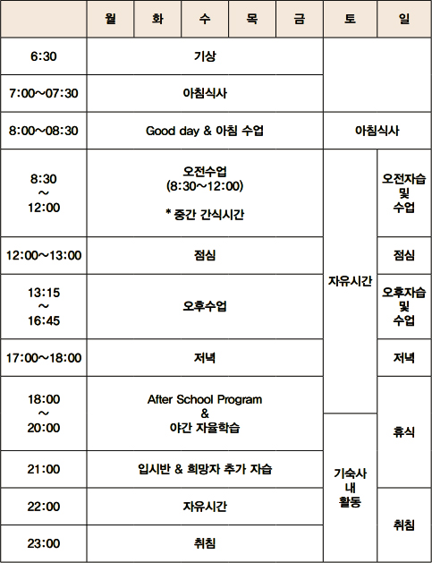 ¢Æ¢Æ ÆòÀÏ ¢Æ¢Æ • 8:00 ~ 16:35 Á¤±Ô¼ö¾÷ • 18:00 ~ 20:00 After School Program ¹× ¾ß°£ ÀÚÀ²ÇнÀ • 20:00 ~ 21:00 Áß±¹´ëÇÐ ÀÔ½Ã¹Ý Ãß°¡ ÀÚ½À