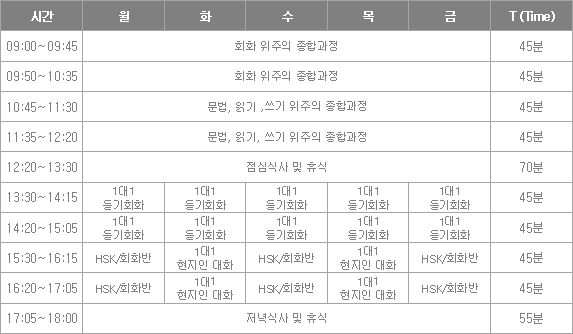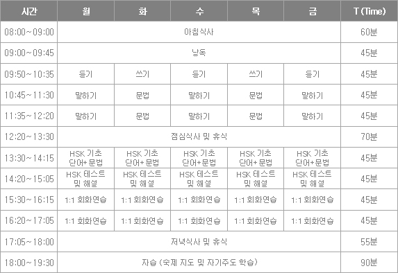 1ÀÏ ÃÑ ¼ö¾÷: [¼Ò¼öÁ¤¿¹ ¼ö¾÷ 4T] + [1:1¼ö¾÷ 2T] + [HSK ¼ö¾÷ 2T] + [ÀÚ½ÀÁöµµ 2T] = [ÃÑ 10±³½Ã ¼ö¾÷]