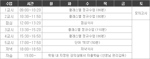 ¡Ü 1ÀÏ ÃÑ ¼ö¾÷: ÆòÀÏ 7~8½Ã°£ Á¤±Ô ¼ö¾÷ (¼Ò¼öÁ¤¿¹¹Ý) ¡Ü ÀÏÁÖÀÏ¿¡ 2ȸ ¹æ°ú ÈÄ, 1:1¼ö¾÷ ÁøÇà (1ȸ 40ºÐ Á¤µµ)